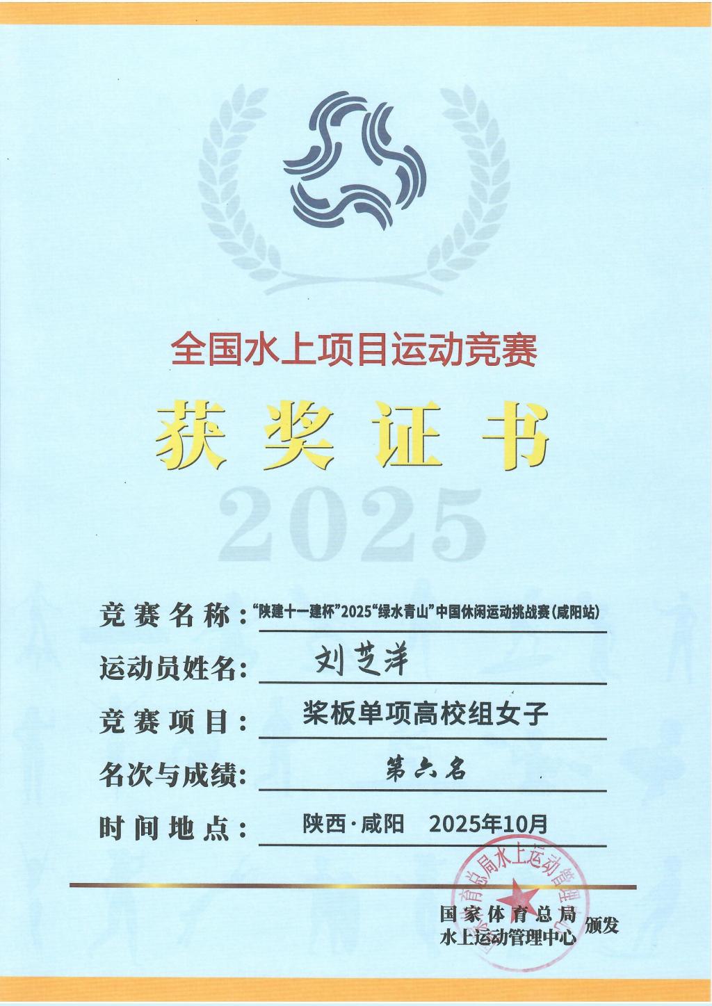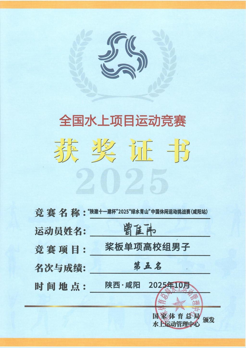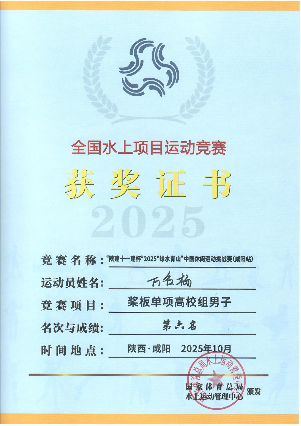 渭南师范学院桨板代表队荣获桨板单项高校组男子第五名、第六名,女子第六名的优异成绩,参赛队员中,有不少是第一次参加全国性赛事,但在比赛过程中,毫不胆怯、敢于争先,收获了宝贵的经验,在国家级赛事中充分展现了顽强拼搏、积极向上的渭师体育人精神。彰显了学院在体育教学与人才培养领域的显著成效,是学院积极响应国家体育强国战略、深化体教融合的有力实践成果。